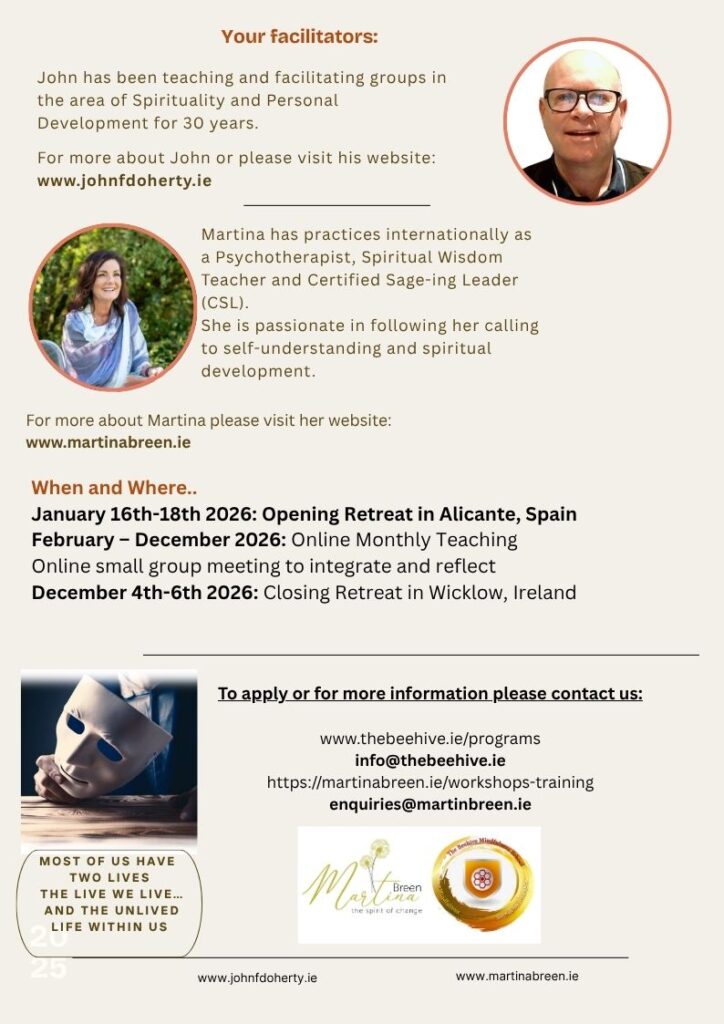 Guided by facilitators John F. Doherty and Martina Breen, and drawing on ancient wisdom traditions and modern contemplative practices, this program supports you to let go of what no longer serves and awaken to what truly matters. Through reflection, meditation, teachings, and community, you will explore your relationship with impermanence and discover the liberating gift of living as if each day truly counts.