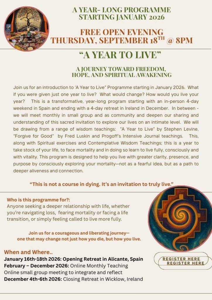 A Year to Live is a powerful and transformative year-long program that offers sacred space for inner renewal, life review, and spiritual awakening. Whether you’re navigating grief, a life transition, or simply feeling called to live with more clarity and depth, this immersive journey invites you to consciously face your mortality and live with greater freedom, presence, and purpose.